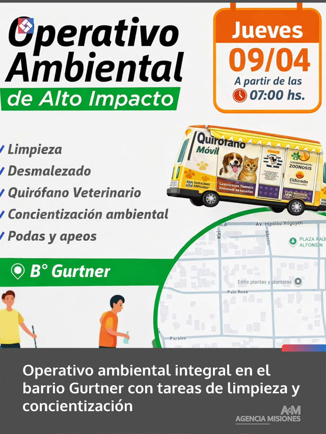 AGENCIA MISIONES.UNO | Este jueves 9 de abril, desde las 7 horas, se llevará a cabo un operativo ambiental de alto impacto en el barrio Gurtner, con múltiples acciones orientadas a mejorar el entorno urbano y promover la participación vecinal.
