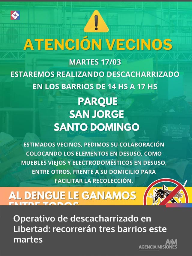 AGENCIA MISIONES.UNO | El municipio de Libertad llevará adelante este martes 17 de marzo un operativo de descacharrizado en distintos barrios de la localidad, con el objetivo de promover la limpieza y prevenir la proliferación de focos de contaminación.