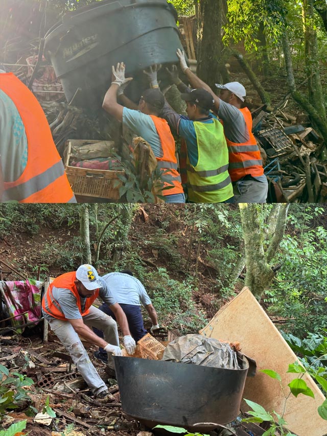AGENCIA MISIONES.UNO | El equipo municipal de Saneamiento Ambiental, junto a Seguridad Ciudadana y el Taller de Tránsito, realizó tareas de descacharrizado y limpieza en un sector del barrio Hermoso, a la vera del arroyo Mbocay, donde se habían acumulado residuos.