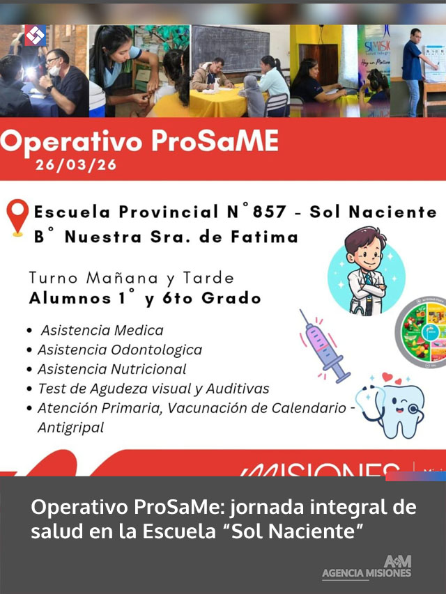 AGENCIA MISIONES.UNO | Este miércoles 26 de marzo se pondrá en marcha un nuevo Operativo ProSaMe en la Escuela Provincial N.º 857 “Sol Naciente”, ubicada en el barrio Nuestra Señora de Fátima, con atención destinada a estudiantes de 1.º y 6.º grado en ambos turnos.