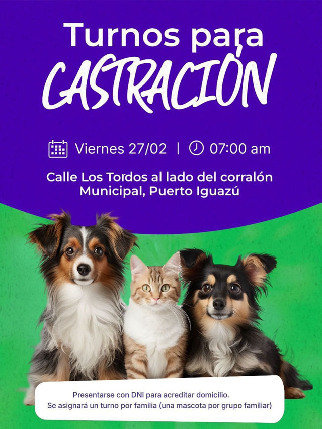 AGENCIA MISIONES.UNO | La Dirección de Zoonosis otorgará este viernes 27 de febrero, desde las 7:00 horas, turnos para castración de mascotas en Calle Los Tordos, junto al Corralón Municipal, en el marco de las acciones de cuidado y prevención animal.