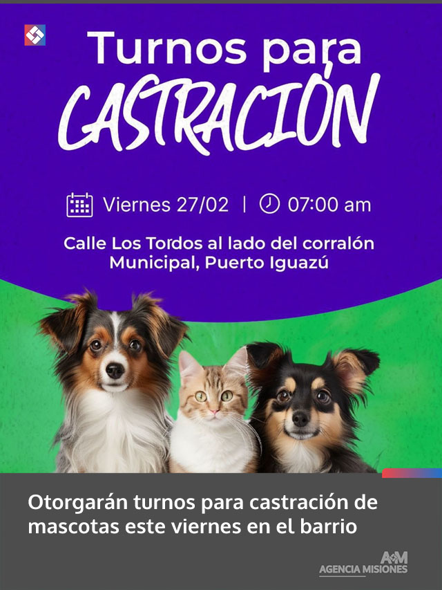 AGENCIA MISIONES.UNO | La Dirección de Zoonosis otorgará este viernes 27 de febrero, desde las 7:00 horas, turnos para castración de mascotas en Calle Los Tordos, junto al Corralón Municipal, en el marco de las acciones de cuidado y prevención animal.