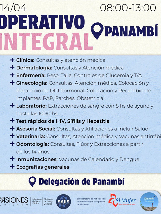 AGENCIA MISIONES.UNO | El próximo 14 de abril se realizará un operativo integral en Panambí, donde vecinos podrán acceder a distintos servicios de salud y asistencia de manera gratuita.