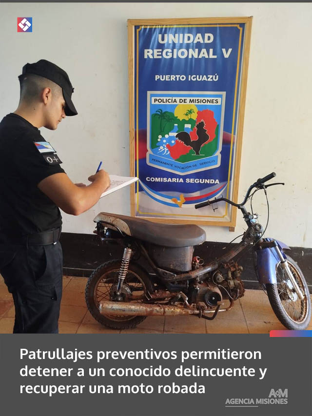AGENCIA MISIONES.UNO | Distintos procedimientos realizados en el marco de patrullajes preventivos permitieron a la Policía de Misiones detener a un joven vinculado a un hecho de robo y recuperar una motocicleta que había sido sustraída días atrás, en operativos desplegados en diferentes barrios de la ciudad.