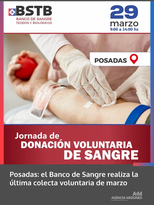 AGENCIA MISIONES.UNO | El Banco de Sangre, Tejidos y Biológicos de Misiones llevará adelante este domingo 29 de marzo una nueva jornada de donación voluntaria en la ciudad de Posadas, con el objetivo de reforzar las reservas del sistema sanitario.
