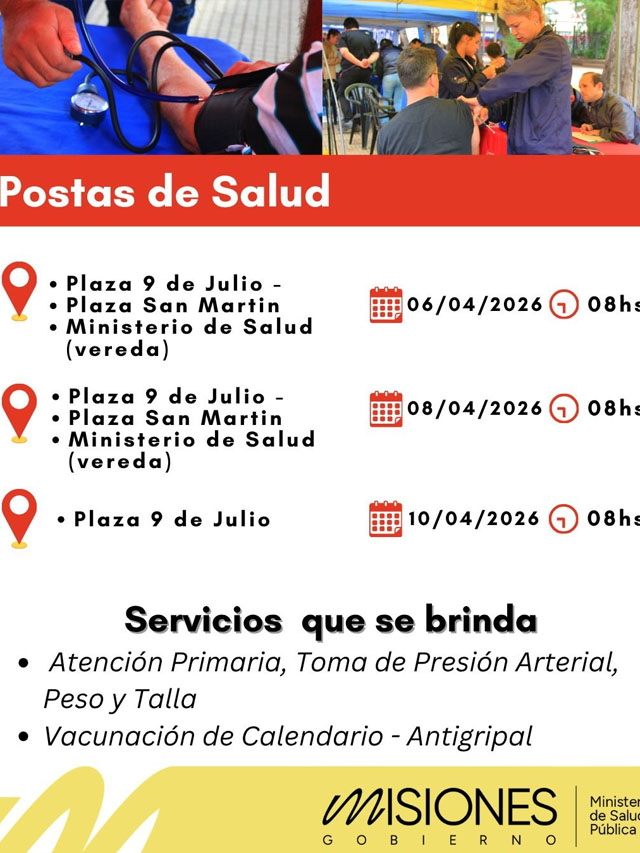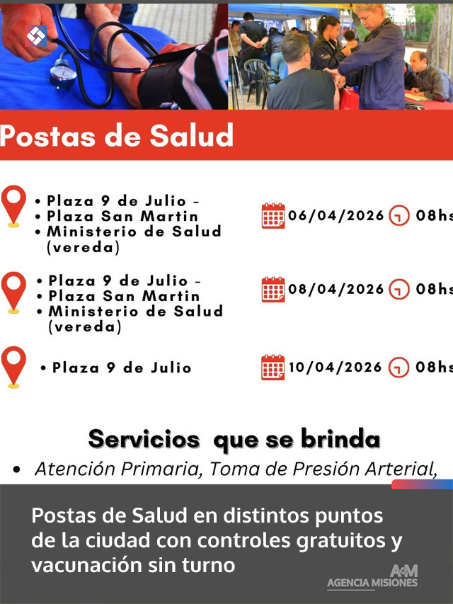 AGENCIA MISIONES.UNO | Durante los días 6, 8 y 10 de abril se llevarán adelante Postas de Salud en espacios públicos y organismos de la ciudad, ofreciendo controles básicos y vacunación de manera gratuita, rápida y sin turno previo.
