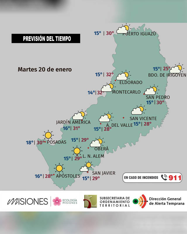 Para este martes se prevé nubosidad parcial y una tarde calurosa, con ambiente agradable durante la mañana y la noche debido a la influencia de una masa de aire seco y vientos predominantes del sector suroeste. No se esperan precipitaciones y la probabilidad de lluvias es baja, aunque se recomienda extremar precauciones ante la fuerte incidencia solar entre las 11 y las 16 horas. La temperatura máxima provincial rondaría los 32 grados en Eldorado, mientras que la mínima sería de 14 grados en Montecarlo.