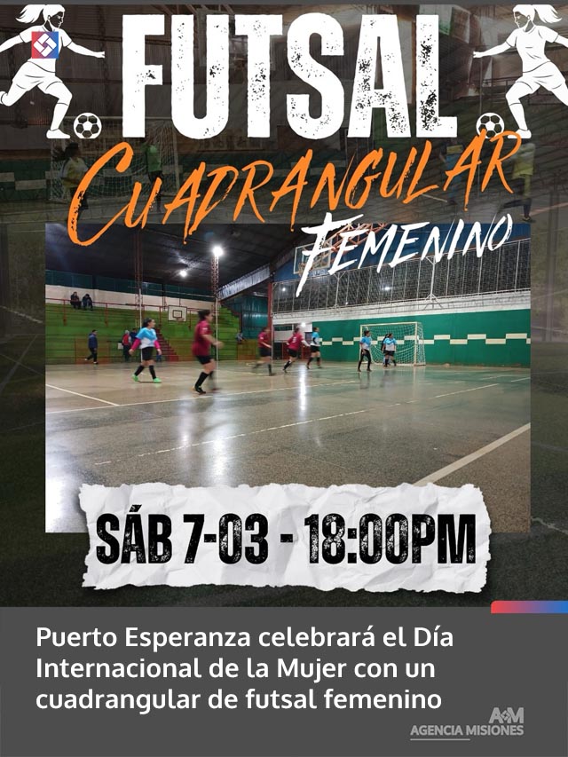 AGENCIA MISIONES.UNO | En el marco de las actividades por el Día Internacional de la Mujer, Puerto Esperanza será sede de un cuadrangular de futsal femenino que reunirá a equipos locales en el Polideportivo Carlos Ortigoza.