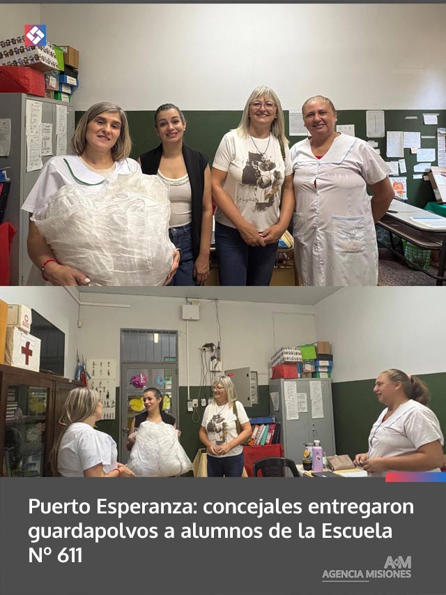 AGENCIA MISIONES.UNO | Las concejales Romina Segovia y Fabiana Wachnitz realizaron la entrega de guardapolvos a estudiantes de la Escuela Nº 611, ubicada en el barrio KM1 de Puerto Esperanza, en el marco de acciones de acompañamiento al inicio del ciclo lectivo.