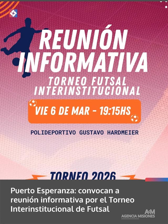 AGENCIA MISIONES.UNO | En Puerto Esperanza se realizará una reunión informativa destinada a instituciones interesadas en participar del Torneo Interinstitucional de Futsal, con el objetivo de coordinar aspectos organizativos y brindar detalles sobre la competencia.