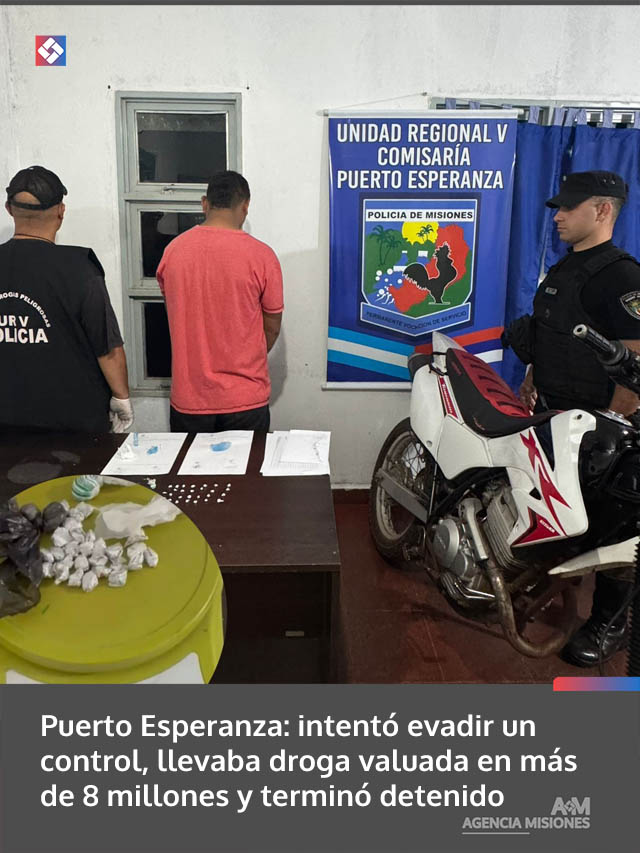 AGENCIA MISIONES.UNO | Un joven de 22 años fue detenido en Puerto Esperanza tras intentar evadir un control policial cuando circulaba en motocicleta. En su poder hallaron 32 envoltorios con estupefacientes, cuyo aforo supera los 8 millones de pesos.