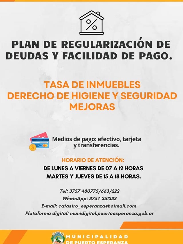 AGENCIA MISIONES.UNO | La Municipalidad de Puerto Esperanza informó que continúa vigente el Plan de Regularización de Deudas, destinado a contribuyentes que deseen ponerse al día con sus obligaciones mediante facilidades de pago.