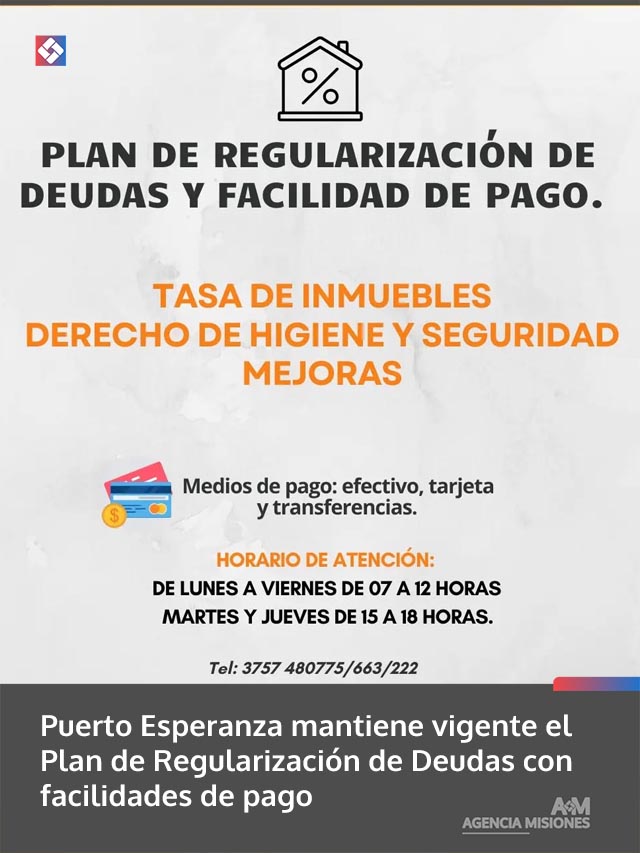 AGENCIA MISIONES.UNO | La Municipalidad de Puerto Esperanza informó que continúa vigente el Plan de Regularización de Deudas, destinado a contribuyentes que deseen ponerse al día con sus obligaciones mediante facilidades de pago.