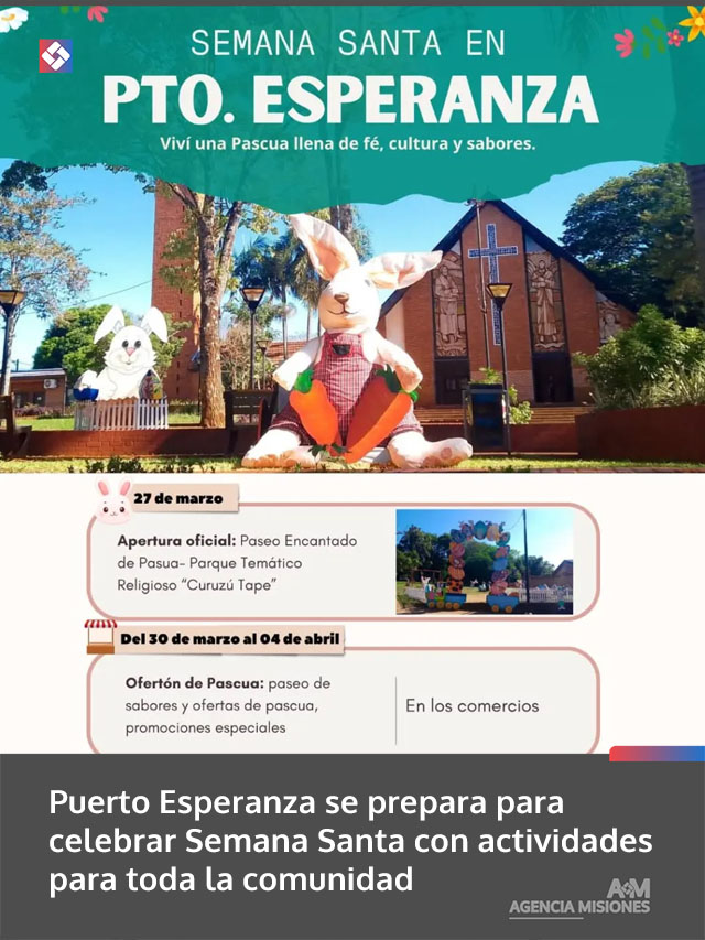 AGENCIA MISIONES.UNO | La localidad de Puerto Esperanza invita a vecinos y visitantes a participar de las propuestas organizadas en el marco de Semana Santa, con una agenda que busca promover la participación comunitaria y revalorizar las tradiciones religiosas y culturales.