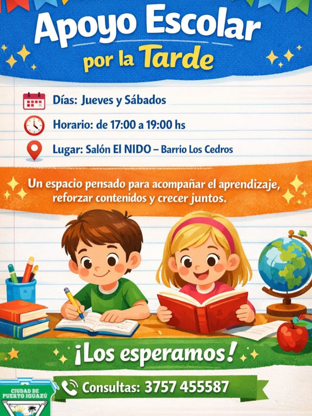 AGENCIA MISIONES.UNO | Se encuentra en funcionamiento un espacio de apoyo escolar en el barrio Los Cedros, destinado a acompañar el aprendizaje de niños y niñas mediante actividades gratuitas orientadas al refuerzo de contenidos educativos.