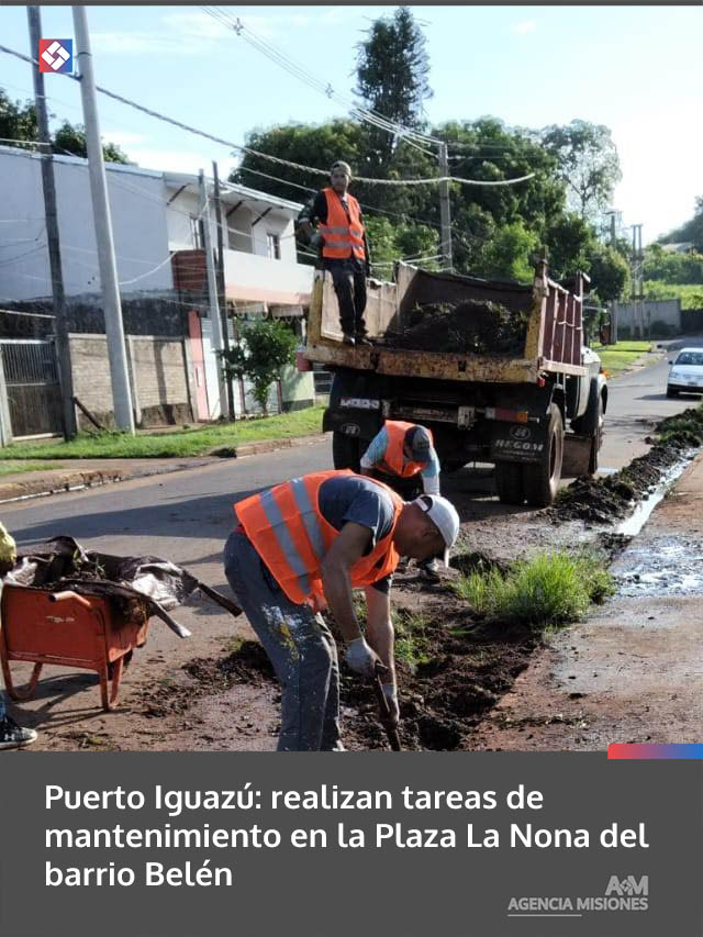 AGENCIA MISIONES.UNO | La Municipalidad de Puerto Iguazú lleva adelante trabajos de mantenimiento en la Plaza La Nona, ubicada en el barrio Belén, con el objetivo de mejorar las condiciones del espacio público para vecinos y familias.