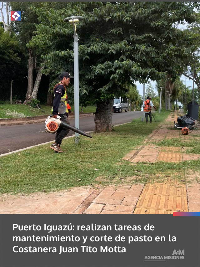 AGENCIA MISIONES.UNO | La Municipalidad de Puerto Iguazú lleva adelante trabajos de parquización y mantenimiento en la Costanera Juan Tito Motta, con el objetivo de poner en valor uno de los principales espacios públicos de la ciudad.