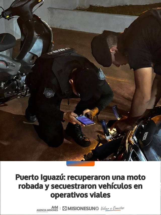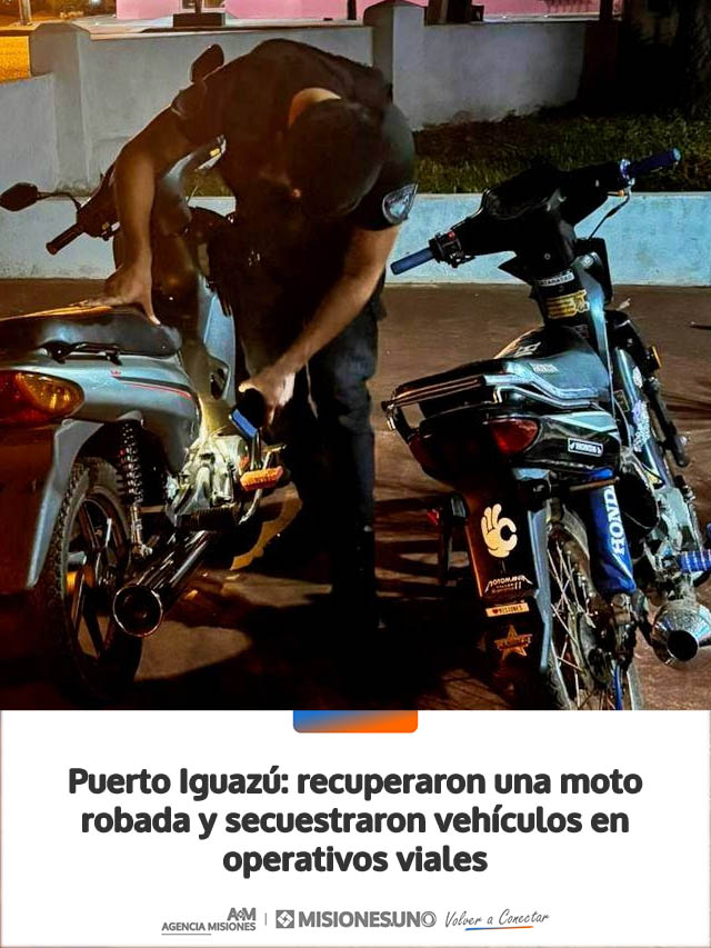 AGENCIA MISIONES.UNO | Operativos de prevención realizados en Puerto Iguazú permitieron recuperar una motocicleta robada y secuestrar varios rodados por infracciones a la Ley Nacional de Tránsito, en procedimientos llevados adelante por distintas dependencias policiales.