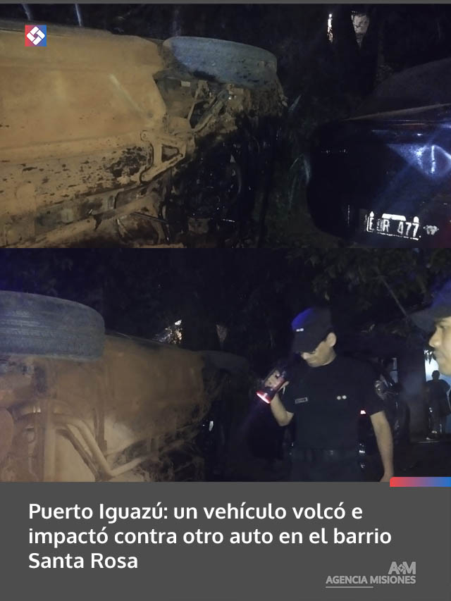AGENCIA MISIONES.UNO | Un siniestro vial se registró este viernes por la noche en Puerto Iguazú, donde un automóvil volcó sobre la avenida Antártida Argentina y terminó impactando contra otro vehículo estacionado en el barrio Santa Rosa.
