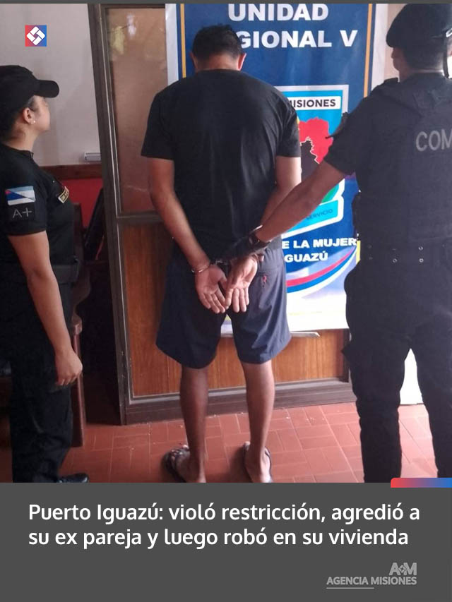 AGENCIA MISIONES.UNO | Un hombre de 43 años fue detenido este domingo en Puerto Iguazú tras ser denunciado por su ex pareja por lesiones, amenazas, desobediencia judicial y robo. La intervención de la Comisaría de la Mujer permitió su aprehensión y el recupero de los elementos sustraídos.