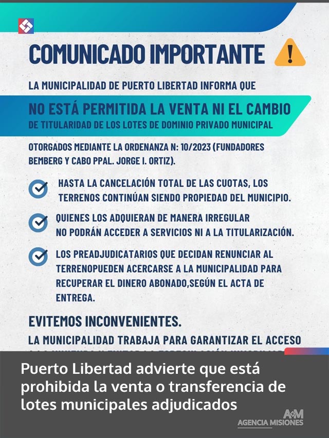 AGENCIA MISIONES.UNO | La Municipalidad de Puerto Libertad informó que no está permitida la venta ni el cambio de titularidad de los lotes de dominio privado municipal adjudicados mediante la Ordenanza N° 10/2023, correspondiente a los sectores Fundadores Bemberg y Cabo Principal Jorge I. Ortiz.