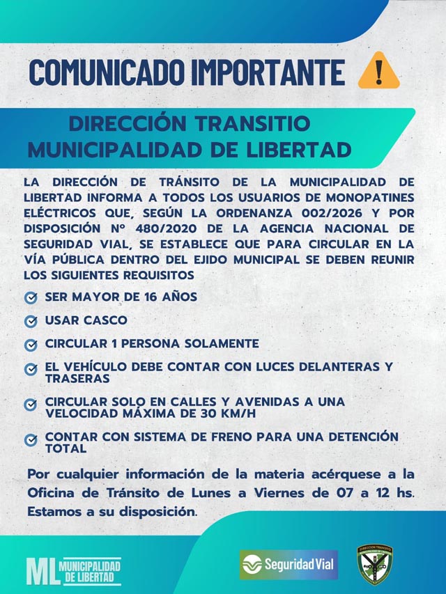 AGENCIA MISIONES.UNO | El municipio de Puerto Libertad informó que se encuentra vigente la Ordenanza N° 02/2024, que establece normas para la circulación de monopatines eléctricos en la ciudad, con el objetivo de reforzar la seguridad vial.