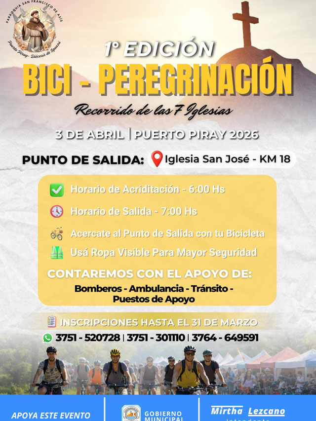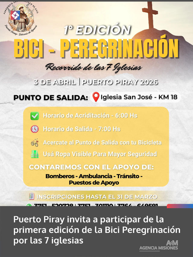 AGENCIA MISIONES.UNO | La localidad de Puerto Piray organiza la primera edición de la Bici Peregrinación, un recorrido por siete iglesias que busca promover la reflexión, el encuentro comunitario y la actividad al aire libre.