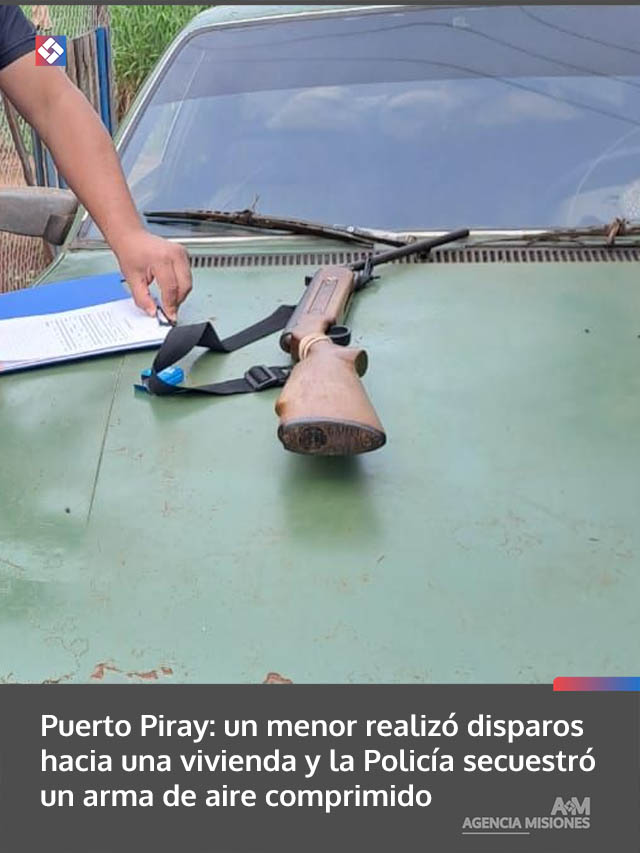 AGENCIA MISIONES.UNO | Un adolescente de 14 años efectuó disparos con un rifle de aire comprimido en Puerto Piray, generando preocupación en una vecina. El arma fue entregada voluntariamente por su padre y quedó secuestrada.
