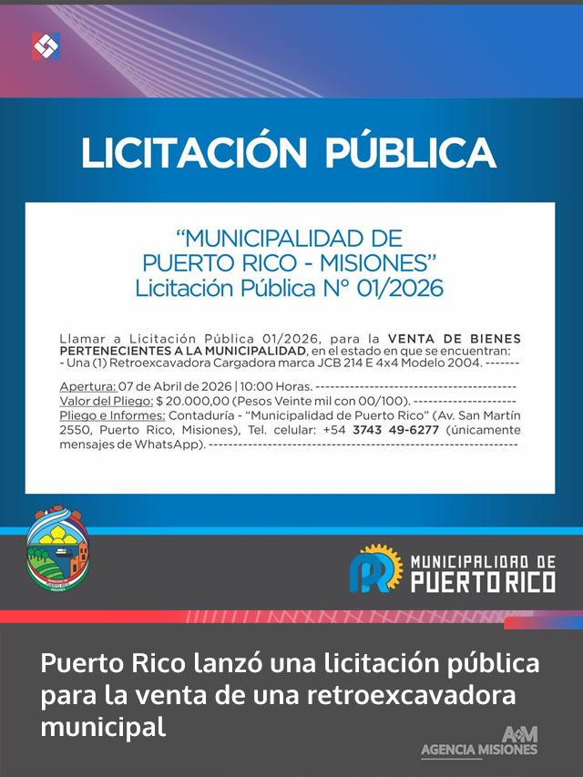 La convocatoria fue realizada por la Municipalidad de Puerto Rico, en la provincia de Misiones, con el objetivo de llevar adelante la venta de bienes pertenecientes al municipio en el estado en que se encuentran. En esta oportunidad, el proceso incluye una retroexcavadora cargadora marca JCB 214 E 4×4, modelo 2004.