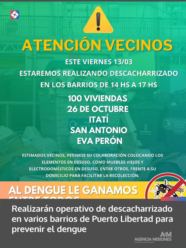 AGENCIA MISIONES.UNO | Con el objetivo de reforzar las acciones de prevención del dengue, este viernes se realizará un nuevo operativo de descacharrizado en distintos barrios de Puerto Libertad.