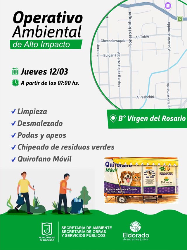 AGENCIA MISIONES.UNO | Este jueves 12 de marzo se llevará adelante un operativo ambiental integral en el barrio Virgen del Rosario de la ciudad de Eldorado, con una jornada de trabajo que comenzará a las 7 de la mañana e incluirá diversas acciones destinadas al mejoramiento del entorno urbano.