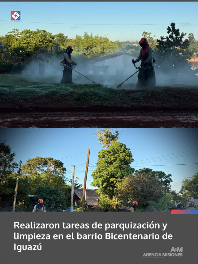 AGENCIA MISIONES.UNO | El equipo municipal de Parquización de Puerto Iguazú llevó adelante trabajos de mantenimiento en el barrio Bicentenario, con tareas de corte de pasto y limpieza en espacios públicos.