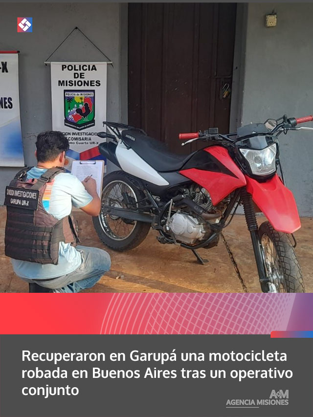 AGENCIA MISIONES.UNO | Una motocicleta con pedido de secuestro por robo en la provincia de Buenos Aires fue recuperada en Garupá durante un operativo conjunto realizado por distintas dependencias policiales, en el marco de una investigación que permitió localizar el rodado.