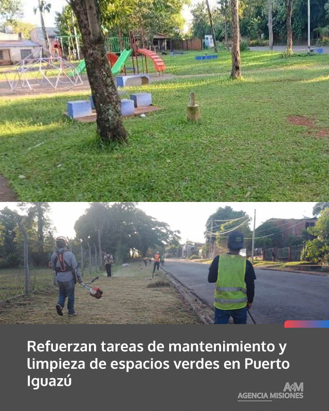 AGENCIA MISIONES.UNO | El equipo municipal de Parquización de Puerto Iguazú continúa desarrollando trabajos de corte de pasto, desmalezado y limpieza en distintos puntos de la ciudad, con el objetivo de preservar y mejorar los espacios verdes.