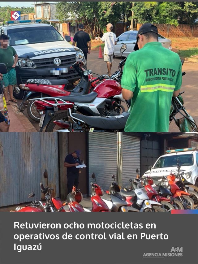 AGENCIA MISIONES.UNO | La Dirección Municipal de Tránsito de Puerto Iguazú, en conjunto con la Policía de la Provincia, llevó adelante operativos de control vial que culminaron con la retención de ocho motocicletas por incumplimiento de las normativas vigentes.