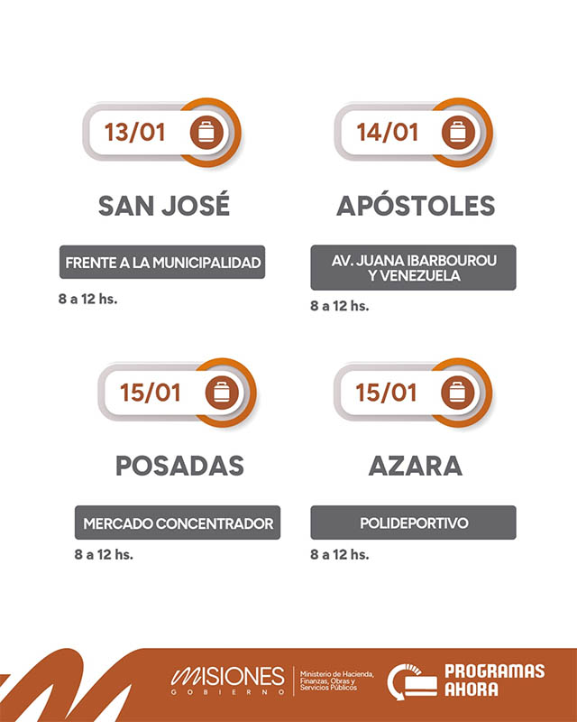 Según lo informado, el lunes 13 de enero el operativo se llevará a cabo en San José, de 8 a 12 horas, frente a la municipalidad. En tanto, el martes 14 de enero el programa estará presente en Apóstoles, en el mismo horario, en la intersección de la avenida Juana Ibarbourou y Venezuela.