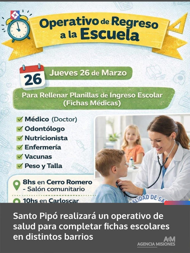 AGENCIA MISIONES.UNO | La Municipalidad de Santo Pipó llevará adelante un nuevo Operativo de Regreso a la Escuela este jueves 26 de marzo, con controles médicos y servicios gratuitos destinados a estudiantes.