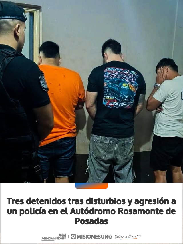 AGENCIA MISIONES.UNO | Un hombre de 25 años fue detenido tras agredir a un efectivo policial y resistirse a la autoridad durante un disturbio registrado en el Autódromo Rosamonte de Posadas. En el marco del mismo procedimiento, otros dos involucrados fueron aprehendidos y puestos a disposición de la Justicia luego de los incidentes registrados en el predio.