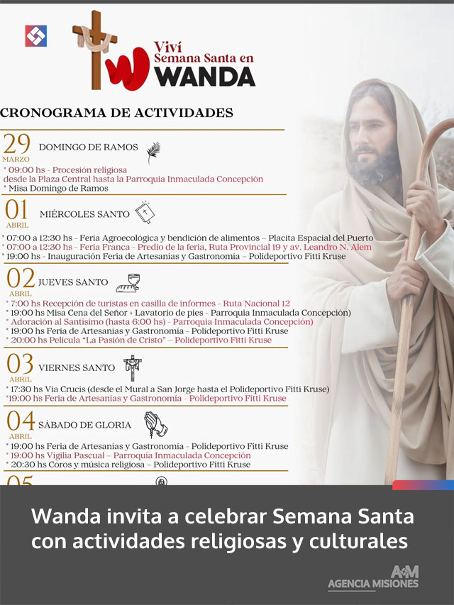 AGENCIA MISIONES.UNO | La Municipalidad de Wanda convoca a la comunidad a participar de las actividades programadas en el marco de Semana Santa, con propuestas que integran celebraciones religiosas y expresiones culturales.