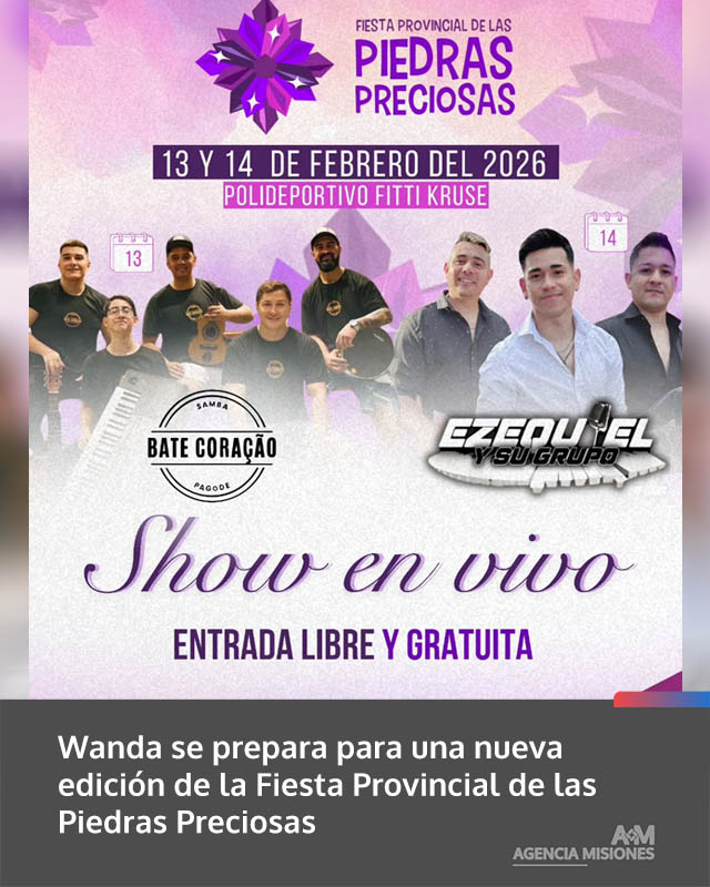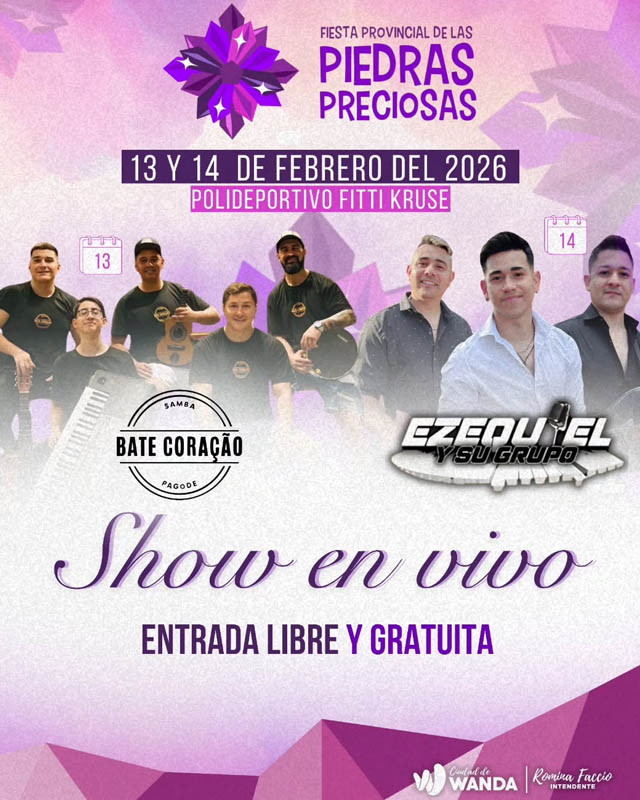 En tanto, el sábado se realizará la elección de la Reina Provincial de las Piedras Preciosas, en una velada que combinará tradición, brillo y música. El cierre artístico estará a cargo de Ezequiel y su Grupo. Desde la Municipalidad de Wanda destacaron que el evento tendrá entrada libre y gratuita, y que busca revalorizar la identidad cultural local y promover el encuentro comunitario.